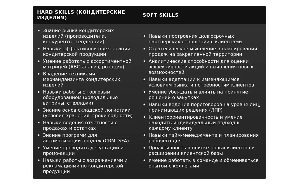 "Навыки: ведение переговоров, работа с клиентами, знание рынка кондитерских изделий, навыки продаж, уверенный пользователь ПК (MS Office, CRM)."