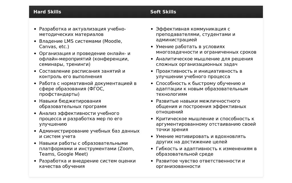 - Организационные навыки: *Организация учебного процесса*, *планирование и координация мероприятий*, *работа с документацией*.