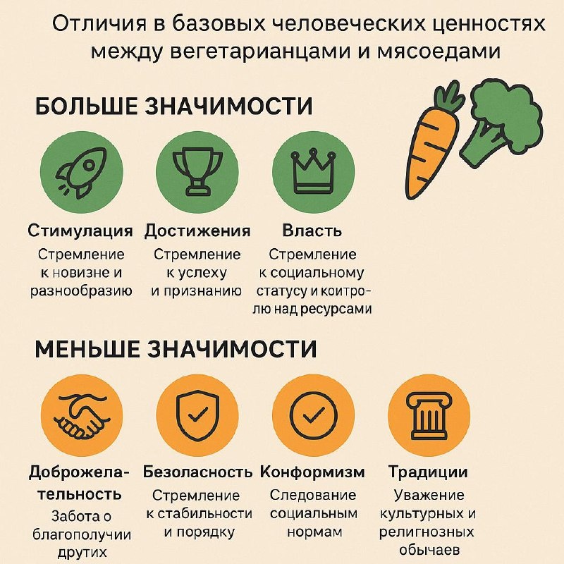 Вегетарианство и ценности: что говорит наука о поведенческих и ценностных различиях вегетарианцев и мясоедов? Недавнее исследование, опубликованное неделю назад в PLOS ONE, проливает свет на то, как базовые ценности различаются между вегетарианцами и мясоедами. Это, как оказалось, не просто вопрос диеты — это отражение глубинных личностных установок и мотиваций. Методология исследования: Психолог Джон Б. Незлек провёл три исследования: • США: 514 вегетарианцев и 540 мясоедов. • Польша: два исследования — одно с 301 вегетарианцем и 335 мясоедами, другое с 68 вегетарианцами и 1943 мясоедами. Для оценки ценностей использовалась классическая методика Шварца (Portrait Value Questionnaire), которая измеряет 10 базовых человеческих ценностей, включая доброжелательность, безопасность, стимуляцию, достижения и власть. Основные результаты 1. Вегетарианцы придают больше значения: - Стимуляции: стремление к новизне и разнообразию. - Достижениям: стремление к успеху и признанию. - Власти: стре