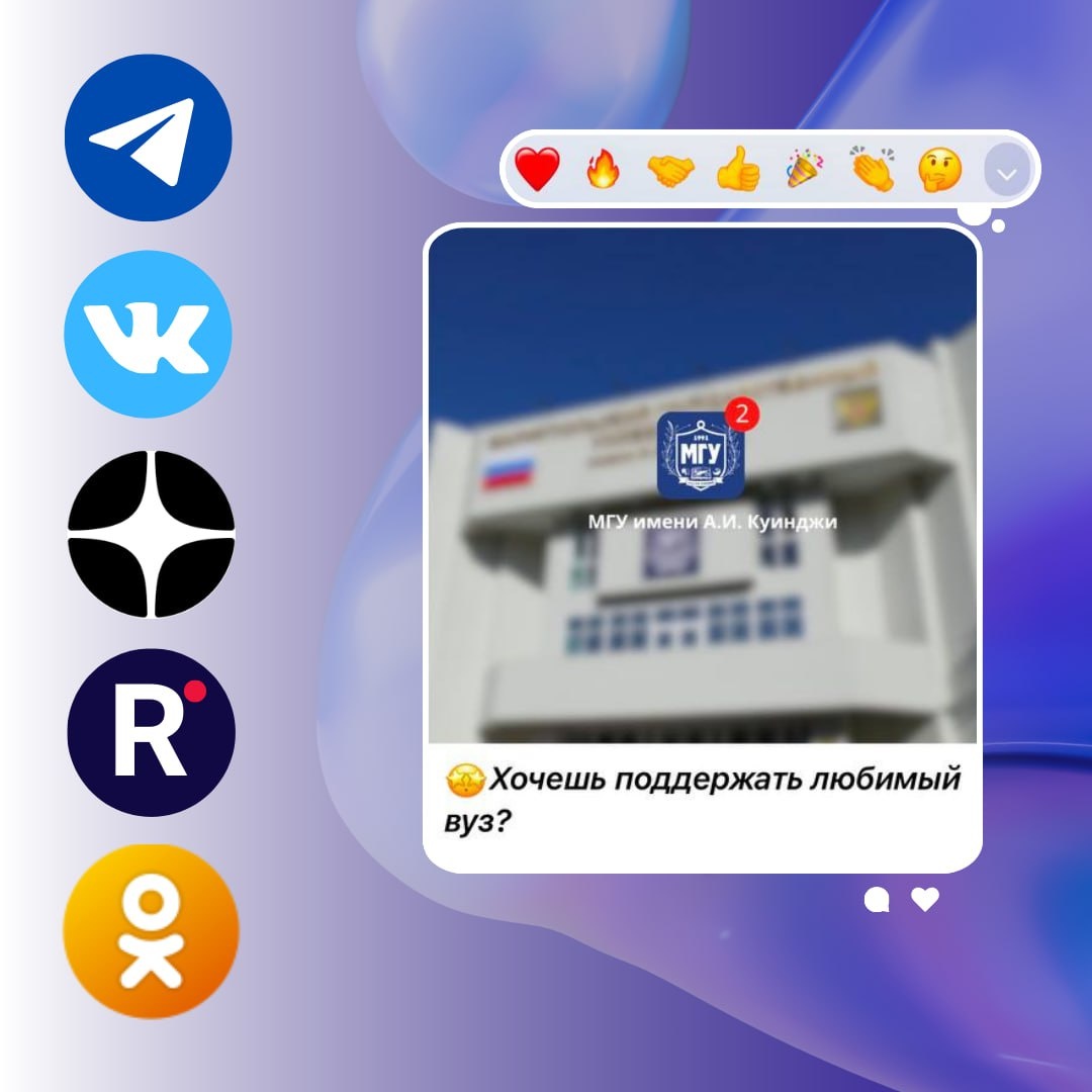 ❤️ Хочешь поддержать любимый вуз? 🤩 Тогда сделай три простых шага ⬇️ 1️⃣Подпишись на все социальные сети университета! 2️⃣Ставь реакции и пиши комментарии — твое мнение важно! 3️⃣Есть Telegram Premium? Голосуй за наш канал, чтобы мы становились еще заметнее! 💙 Будь в курсе всех событий, которые происходят в МГУ имени А.И. Куинджи! 🌐Telegram 🌐Rutube 🌐ВКонтакте 🌐Дзен 🌐Одноклассники 🌎Сайт 🌐Медиацентр МГУ имени А.И. Куинджи #МГУимениКуинджи #ГолосуйЗаНас