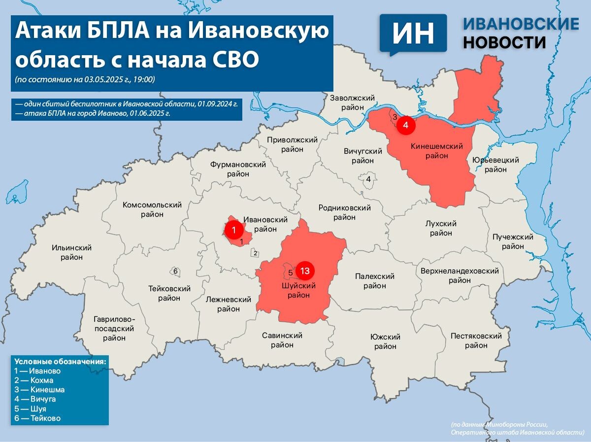 В связи с увеличением числа налетов украинских беспилотников на территорию Ивановской области, "Ивановские новости" объявляют о запуске интерактивной карты, на которой будут отображаться все зафиксированные атаки. Напомним, первый беспилотник был замечен 1 сентября 2024 года, а следующая атака произошла 16 апреля 2025 года в Шуйском районе. В связи с растущей угрозой и необходимостью информирования жителей, карта будет регулярно обновляться по мере развития событий, предоставляя жителям актуальную информацию о ситуации в регионе. Отметим, что данные для составления карты берутся из официальных источников: Минобороны России и Оперативного штаба Ивановской области. Красным кружком обозначены районы/города, в котором замечены были беспилотники. Некоторые населенные города обозначены цифрами. Соответствующие условные обозначения указаны внизу.
