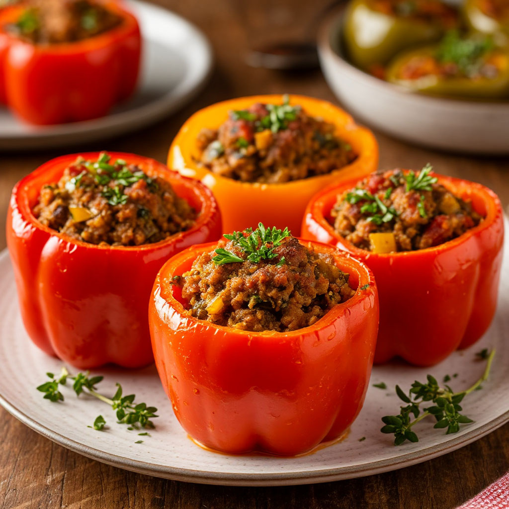 Ингредиенты: Приготовление: 1. Подготовка овощей: 2. Приготовление начинки: 3. Подготовка перцев: 4. Сборка блюда: 5. Приготовление: Подача: