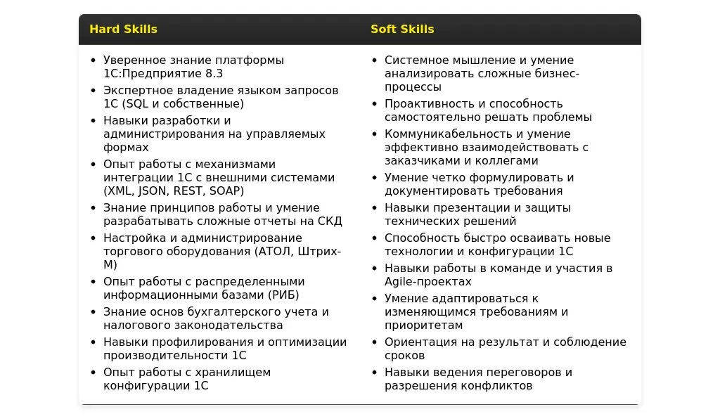 На что обращать внимание: При изучении требований вакансии 1С программиста, особое внимание уделяйте используемым конфигурациям, необходимым навыкам разработки и опыту работы с интеграциями. Анализируйте не только явные требования, но и "скрытые" требования, чтобы понять, насколько ваш опыт соответствует ожиданиям работодателя.