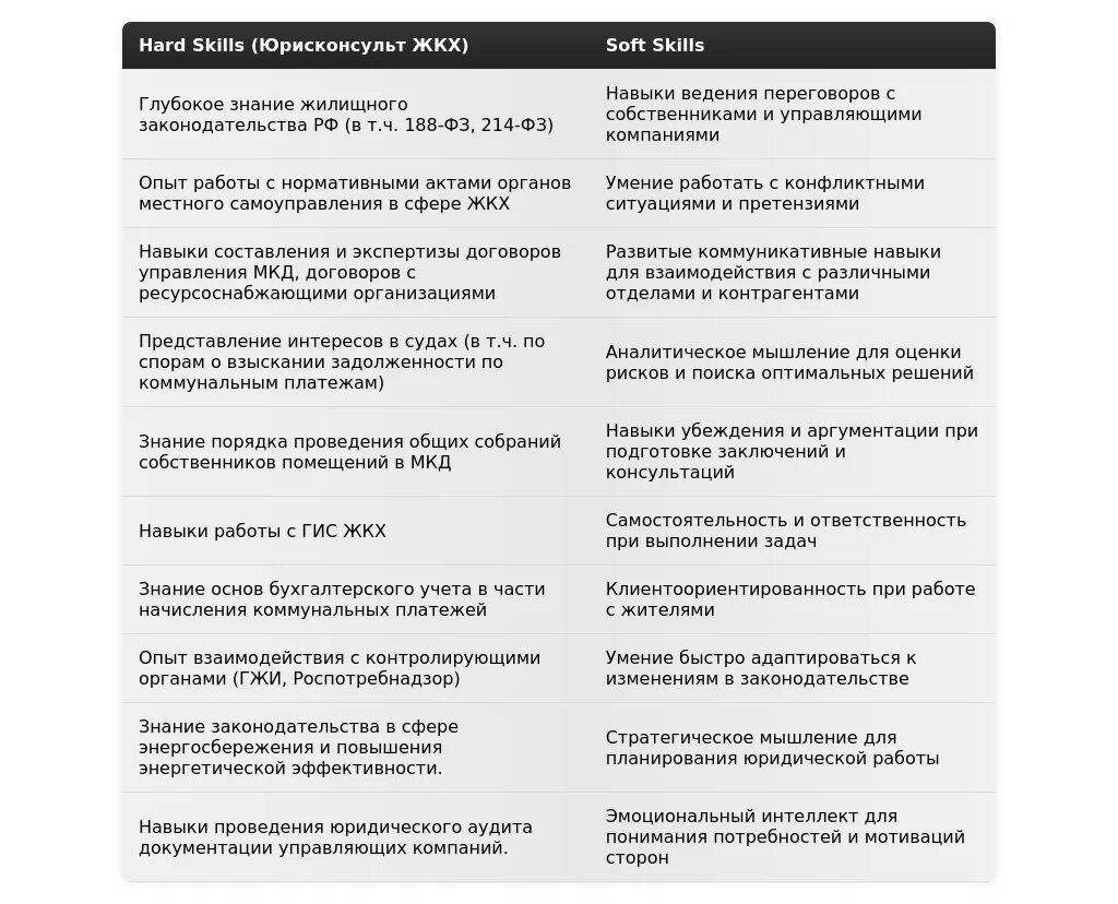 - Что обязательно включить:Ключевые навыки и компетенции, релевантные для позиции юрисконсульта в ЖКХ.
