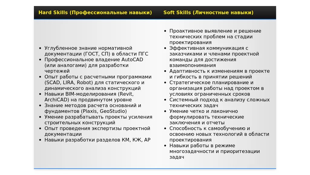 - Что обязательно включить:Ключевые навыки и компетенции, релевантные для профессии проектировщика ПГС.