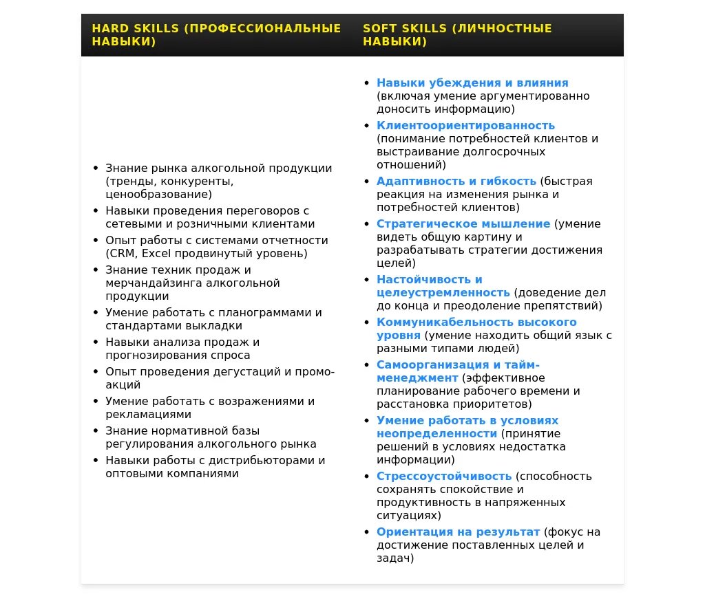 - Какую информацию обязательно включить:Ключевые навыки и компетенции, релевантные для профессии (например, навыки продаж, ведения переговоров, знание рынка алкогольной продукции).