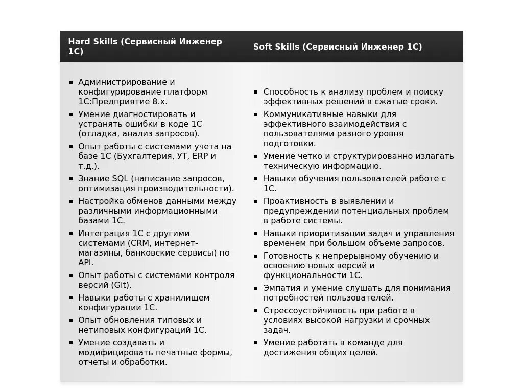 Раздел "Навыки" – это ваша возможность продемонстрировать свои профессиональные навыки и знания, необходимые для успешной работы сервисного инженера 1С.