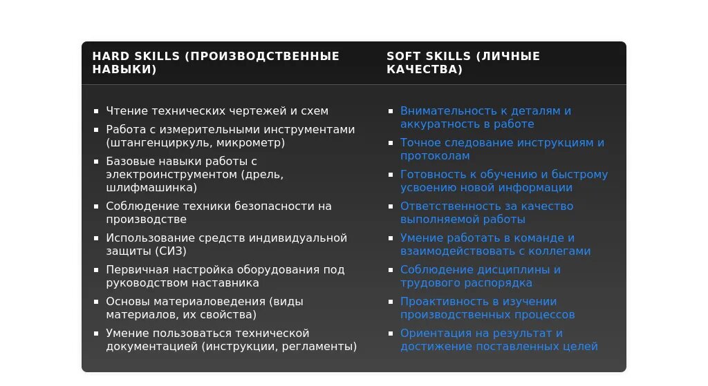 - Профессиональные навыки: Навыки, связанные с производством (работа с инструментом, чтение чертежей, знание техники безопасности).