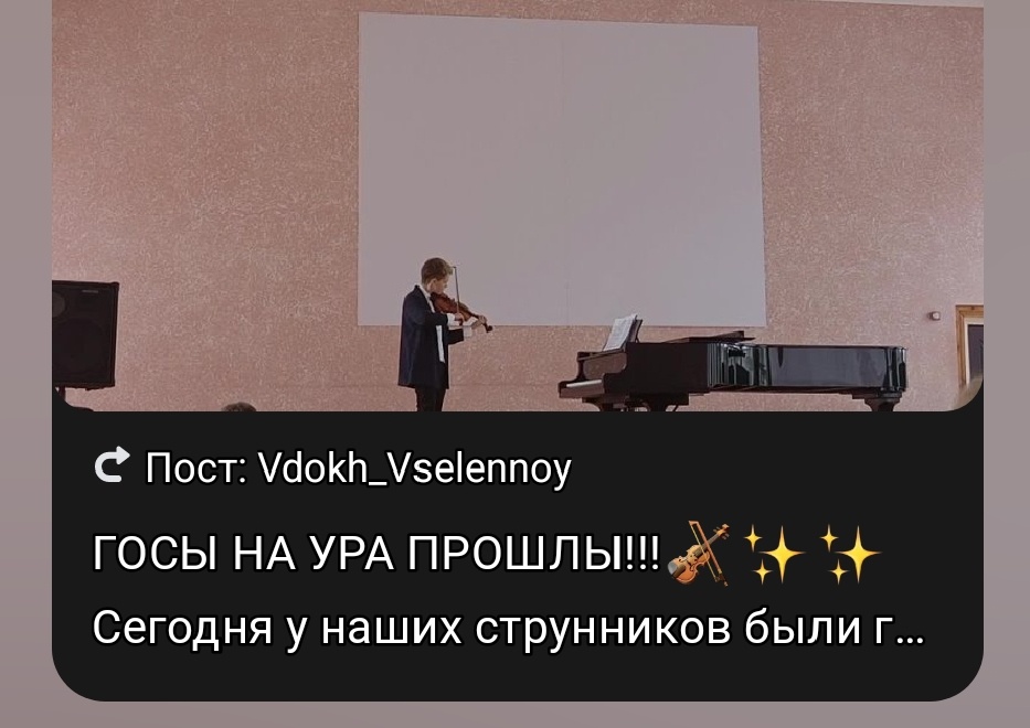 ГОСЫ НА УРА ПРОШЛЫ!!!🎻✨✨ Сегодня у наших струнников были госы в СККИ. Все НА ОТЛИЧНО сыграли! Волнительный процесс был для трёх замечательных скрипачек и одного виолончелиста, которые сдавали госы, особенно для тех, кто поддержал их на важном событие: наши преподаватели, концертмейстеры, родители и близкие люди!!! Поздравляю!!! Молодцы!!! Я за вас рада, особенно когда увидела наших преподавателей из колледжа искусств и куратора!🎻🎹🎶 Ещё раз поздравляю вас, в том числе и мою подружку Дашку Седых!!! Теперь вы музыканты-коллеги😊♥️✨✨ 3 Июня, 2025 год. (Вторник. 11:00 — 13:00) 1) VK/Vdokh_Vselennoy: 2) Author: 3) Проза.ру Теги: #Vdokh_Vselennoy #МирраДеМарри #MirraDeMarri #IT #It_227 #It_Мероприятие #КолледжИскусств #СККИ #Госы #Госы2025 #ГосыСтрунники #ГосыУСтрунников #Струнники #Скрипка #Виолончель #ДарьянСедых