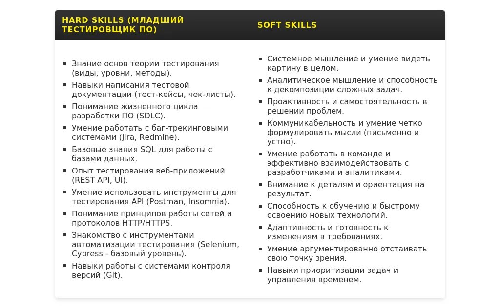 "Технические навыки: HTML, CSS, JavaScript, SQL. Инструменты: Jira, TestRail, Postman. Soft skills: Внимательность, ответственность, коммуникабельность."