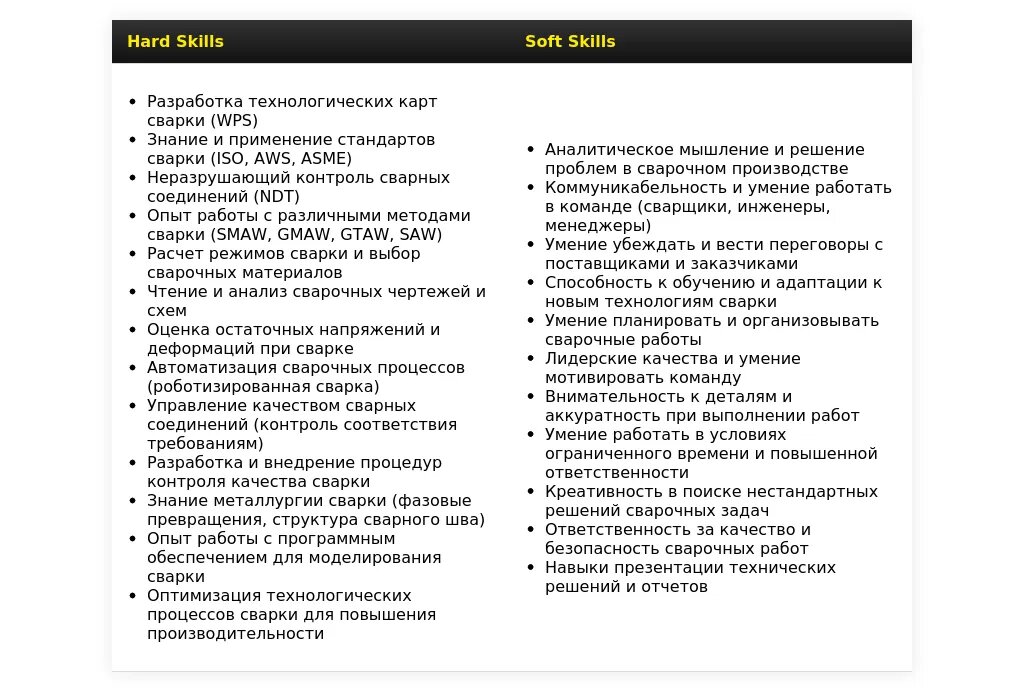 Ключевые навыки и компетенции, релевантные для вакансии (например, знание нормативной документации, опыт работы с определенными видами сварки, навыки контроля качества).
