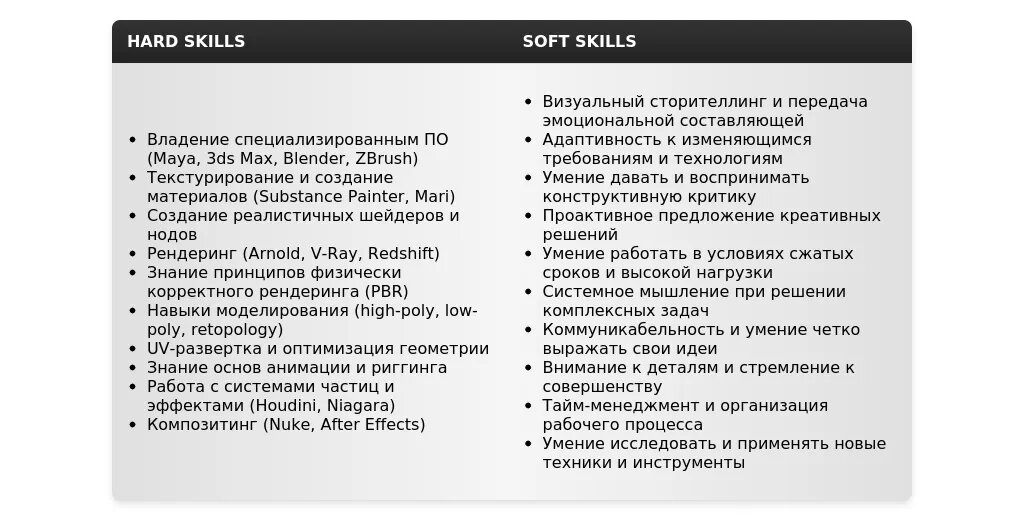 - Программное обеспечение: "Maya", "3ds Max", "ZBrush", "Substance Painter", "Photoshop", "Blender", "Unreal Engine", "Unity".