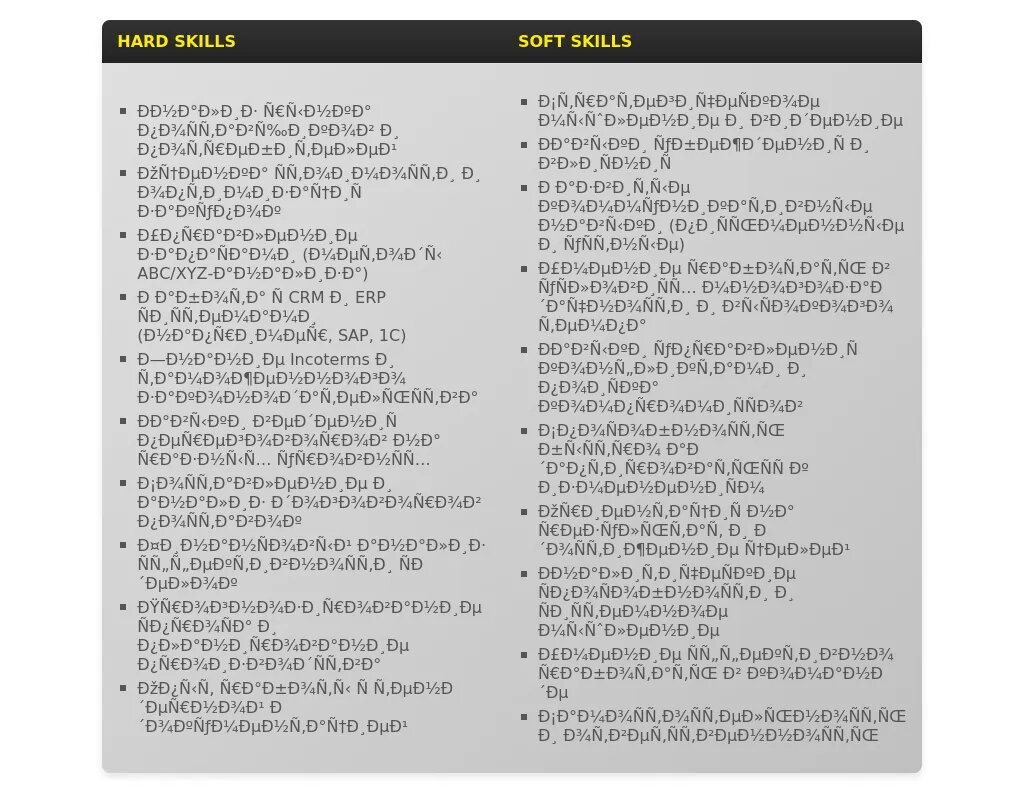 - Навыки: Список навыков должен отражать ключевые компетенции, необходимые для успешного выполнения работы.