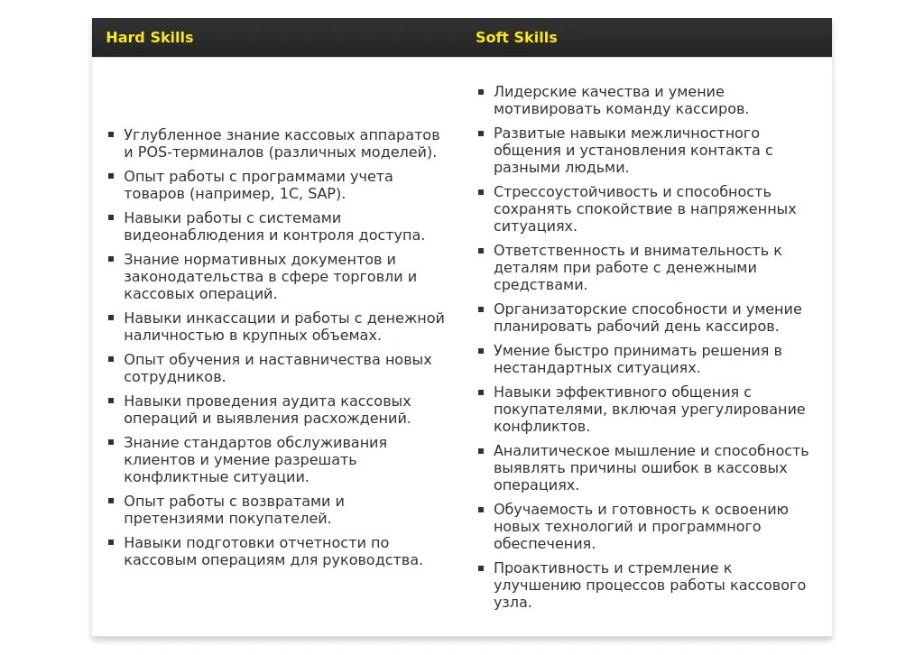 - Для супермаркетов: "обеспечение бесперебойной работы кассового узла", "контроль соблюдения кассовой дисциплины", "работа с большим потоком покупателей", "разрешение конфликтных ситуаций", "обучение новых кассиров".