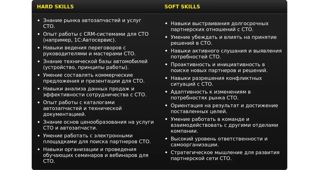 Анализ: Обязателен опыт работы с СТО и знание устройства автомобилей. Навыки переговоров и знание 1С – важные, но могут быть развиты.