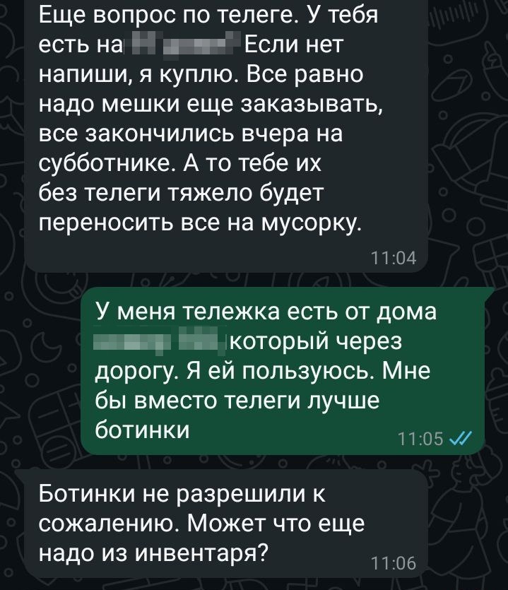 Ботинки за полтора года ушли в минус — держались на силе воли, клее и мозолях. Прошлые боты покупал сам, а в этот раз решил не геройствовать и спросил у нанимателя: можно ли компенсировать покупку новых? Тем более, за всё время ни лопату, ни метлу, ни совок, ни скребок не просил. Всё своё, куплено на личные деньги, потому что люблю выбирать сам. Перчатки берегу, мешки использую по два-три раза — экономлю бюджет жильцов, как могу.