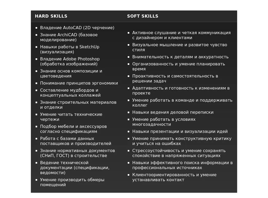 - Желательные: (не указаны явно, но подразумеваются) - знание основ дизайна интерьера, умение работать с большим объемом информации.
