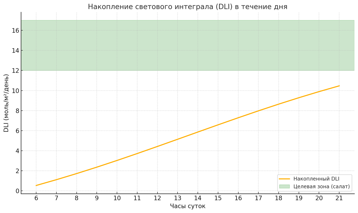 Световой интеграл (DLI, Daily Light Integral) - это суммарное число фотосинтетически-активных фотонов, попадающих на 1 м² листовой поверхности за сутки. Измеряется в моль м⁻² день⁻¹ и отвечает на вопрос «сколько света нужно растениям». Свет - лимитирующий ресурс наравне с водой и питанием: недобор DLI тормозит фотосинтез и удлиняет вегетацию, избыток вызывает стресс и лишние расходы на досветку. Зная норму DLI для каждой культуры, фермер может синхронизировать сроки созревания, сэкономить электроэнергию и спрогнозировать урожай. Пример. Если PPFD = 250 µmol m⁻² s⁻¹ и досветка длится 16 ч, то 250 × 3 600 × 16 / 1 000 000 ≈ 14 моль м⁻² день⁻¹ - как раз середина оптимума для салата. Продлить фотопериод, увеличить мощность светильников, отчистить плёнку/стёкла, добавить отражатели. Задиммировать LED, натянуть затеняющую сетку, улучшить вентиляцию и подачу CO₂. Скачивайте приложение Gros.farm сегодня, чтобы начать прогнозировать свой урожай и увеличивать прибыль!