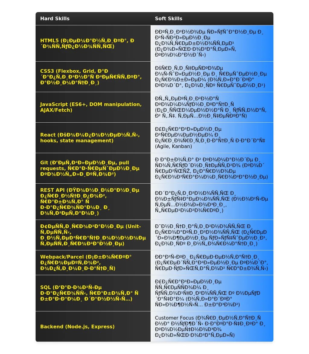 - Технические навыки: HTML, CSS, JavaScript, знание фреймворков (React, Angular, Vue.js - если есть).