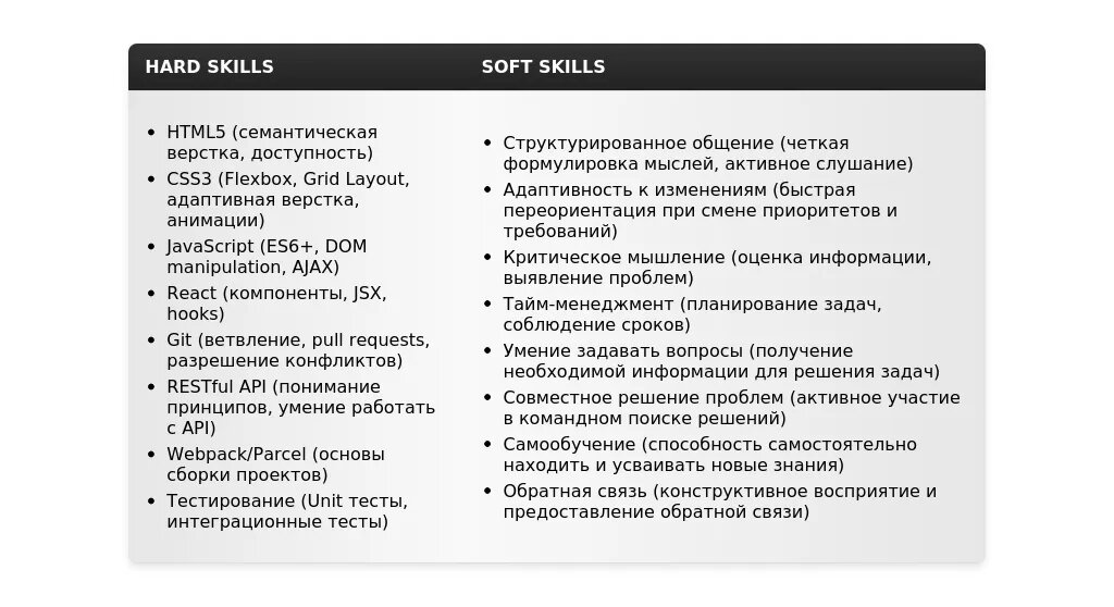 - Приведите примеры: По возможности, приведите примеры использования каждого навыка в своих проектах.
