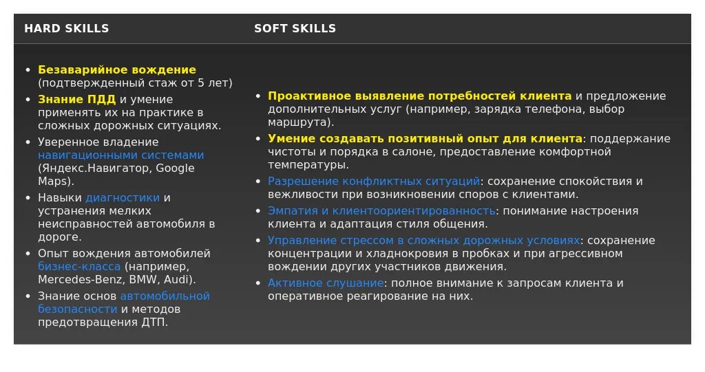 Раздел "Навыки" – это перечень ваших профессиональных навыков, которые важны для работы водителем бизнес-такси. Важно перегруппировать навыки под конкретную вакансию, чтобы показать работодателю, что вы обладаете всеми необходимыми компетенциями.