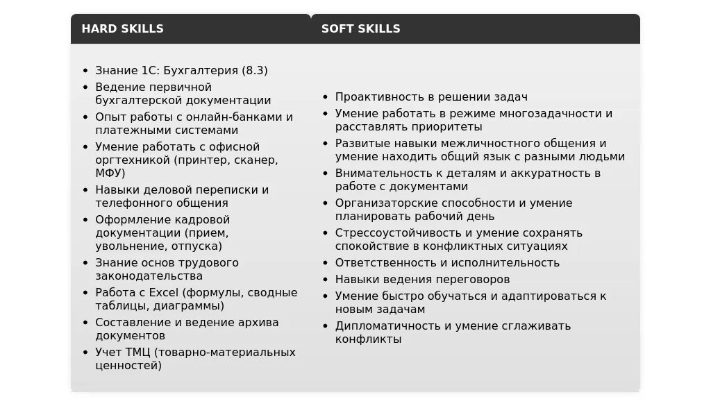 - Бухгалтерские навыки: Ведение первичной документации, знание основ бухгалтерского учета.