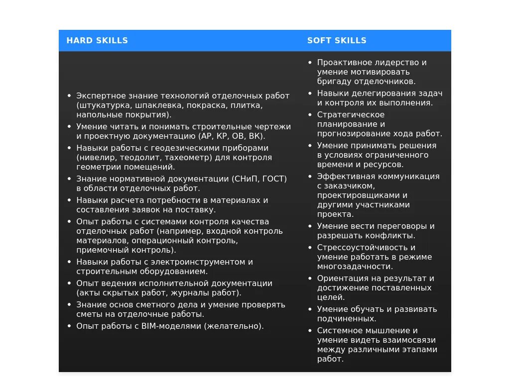 - Реставрация: "Опыт работы с историческими зданиями", "Знание технологий реставрационных работ", "Умение работать с проектной документацией по реставрации".