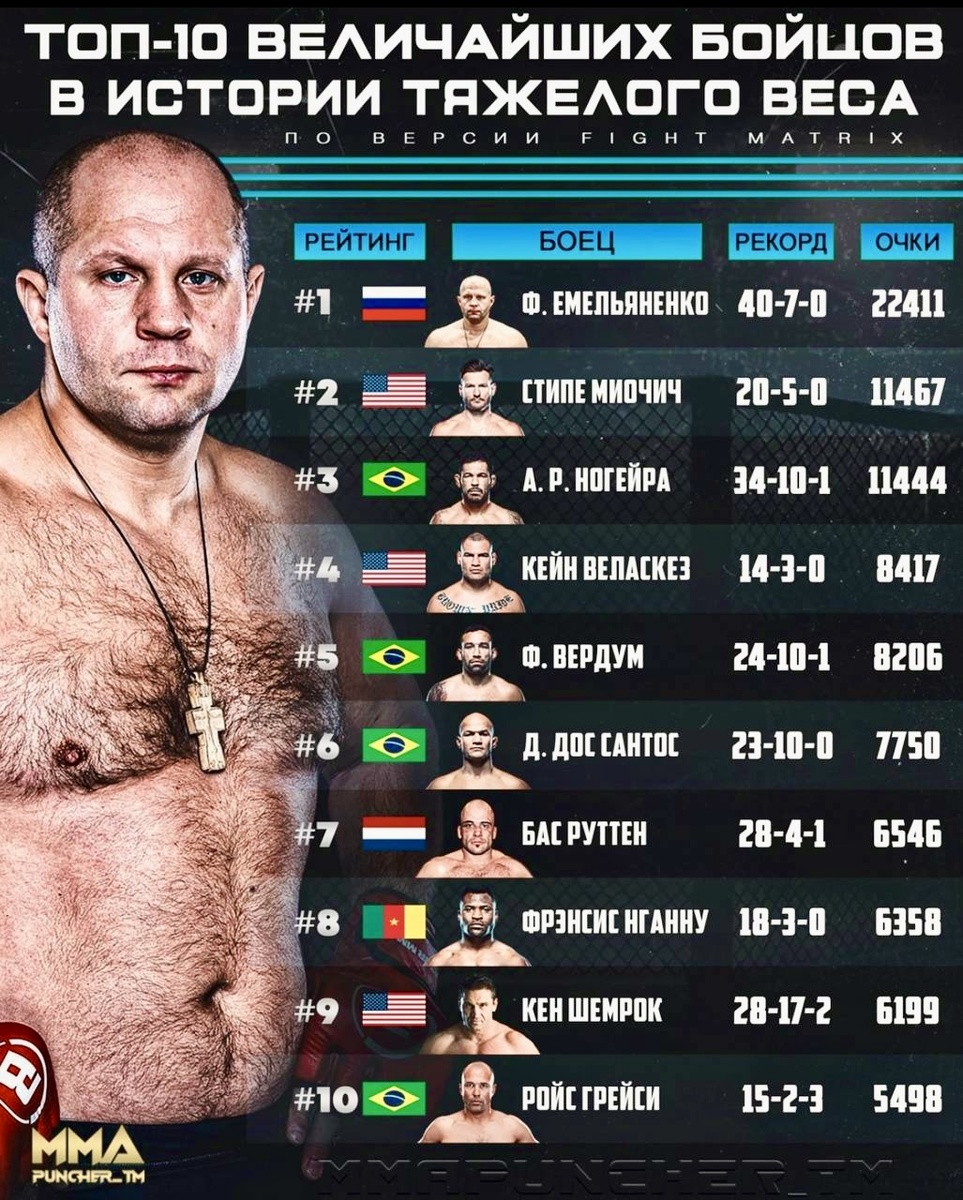 Тяжёлый вес в MMA всегда был домом для самых мощных, зрелищных и доминирующих бойцов. Кто же входит в число величайших тяжеловесов всех времён по версии авторитетного статистического портала Fight Matrix? Рейтинг Fight Matrix:22,411 🔹 Прозвище: "Последний Император" 🔹 Пик карьеры: 2000-2009 (28 побед подряд) 🔹 Ключевые победы: Мирко Крокоп, Антонио Ногейра (2 раза), Кевин Рэндлмен 🔹 Титулы: Чемпион Pride FC, WAMMA Фёдор доминировал в Pride FC, оставаясь непобеждённым почти 10 лет. Его стиль - взрывные удары, холодная выдержка и мастерство в грэпплинге - сделал его легендой MMA. Fight Matrix ставит его на первое место благодаря беспрецедентной серии побед над топовыми бойцами эпохи. Рейтинг Fight Matrix: 11,467 🔹 Прозвище: "Stone Cold" 🔹 Пик карьеры: 2016-2020 🔹 Ключевые победы: Франсис Нганну (2-й бой), Даниэль Кормье (2 раза) 🔹 Титулы: Двукратный чемпион UFC Миочич - рекордсмен UFC по защитам титула в тяжёлом весе. Его боксёрская техника и выносливость позволили