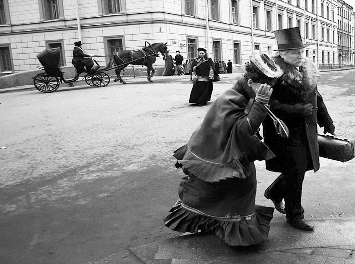 Конец 19-го века, возможно самое начало 20-го... На снимке пожилая пара идет по Миллионной улице в самом центре старого Петербурга. Дама прикрывает лицо, чтобы не попасть в кадр.