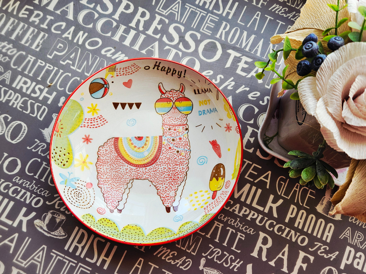 Люблю красивые тарелочки. Поэтому у меня вечно то такая, то сякая, одиночки, помимо обычных тарелок. А еще я люблю лам и альпак. Они милейшие 😃. Тарелка O'Kitchen 18 см "Лама" Место покупки: Fix price Цена: 99 руб Заскочила в Фикс Прайс за мелочами и увидела эту тарелку. Не смогла пройти мимо. Сейчас жалею, что не взяла несколько. И не взяла пиалу и чашку. Материал - фарфор. Сделана качественно, без сколов, толстые края и достаточно ровный рисунок. Чем грешит Фикс, так это криво расписанной посудой и сколами. Тут прям все ровненько. Хорошая глубина, подходит и под супы, и под вторые блюда, и под закуски. Я уже и не помню, что там за значки на этикетке были, но мою я ее все 5 лет в посудомойке! Ни капли не испортился ни рисунок, ни сам фарфор. Выглядит как новая! Использую тарелку ежедневно. Так же спокойно грею ее в микроволновке. "Лама" пережила один переезд, была упакована вместе со всеми другими тарелками одинаково. Хотя мне пророчили, что посуда из Фикса недолговечна, хруп