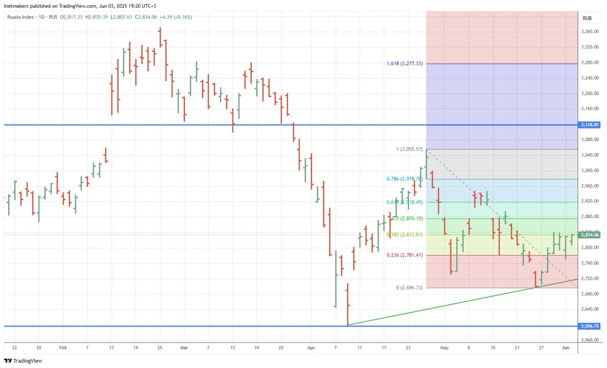 ❗️3 июня российский фондовый рынок показал рост, индекс МосБиржи укрепился на 0,16% до уровня 2834,06.