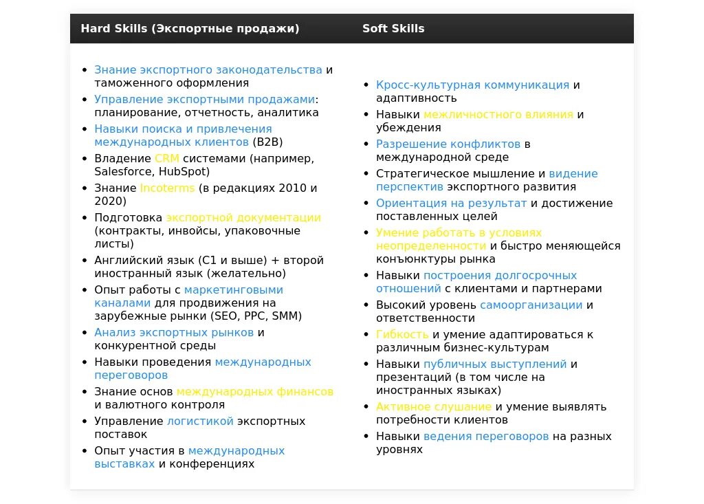 - Какую информацию обязательно включить:Ключевые навыки, релевантные для позиции менеджера по продажам (на экспорт).