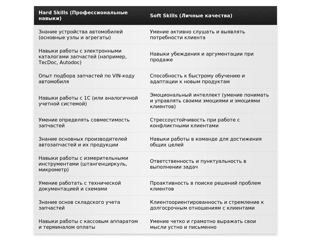 - Умение работать с каталогами автозапчастей.