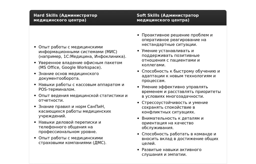Раздел "Навыки" должен четко и лаконично отражать ваши ключевые компетенции, которые необходимы для успешного выполнения обязанностей администратора медицинского центра. Ваша задача – показать работодателю, что вы обладаете необходимыми знаниями и умениями для эффективной работы.