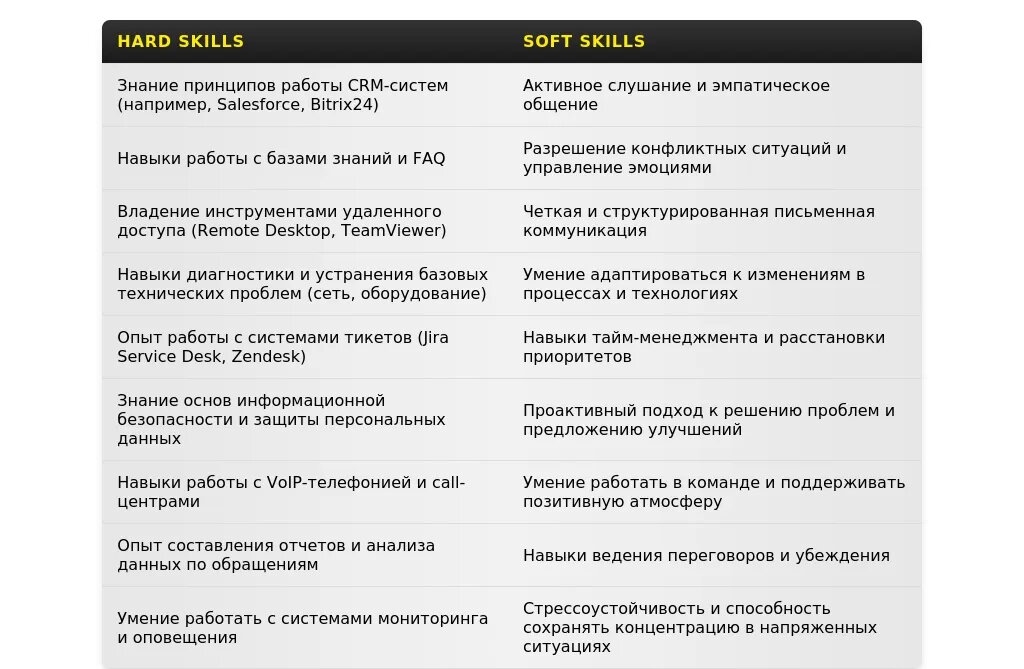 - Call-центр: "Обработка входящих/исходящих вызовов", "Консультирование клиентов", "Решение проблем клиентов", "Работа с возражениями", "Ведение отчетности".