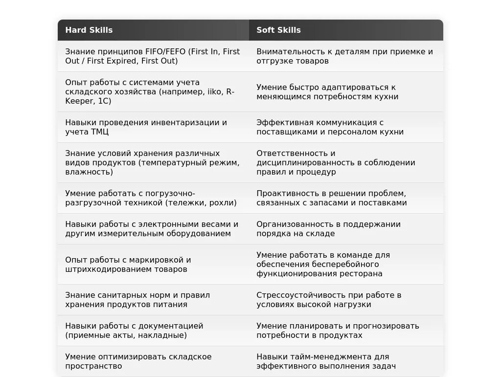 Адаптированный раздел "Навыки": "Знание правил хранения и обработки *рыбы и морепродуктов*, работа с программой складского учета, контроль за соблюдением санитарных норм."