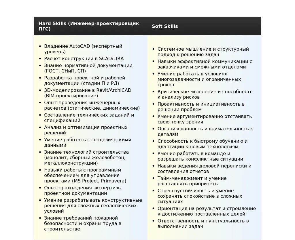 - Используйте категории: Разделите навыки на категории (например, "Программное обеспечение", "Нормативная документация", "Проектирование") для удобства чтения.