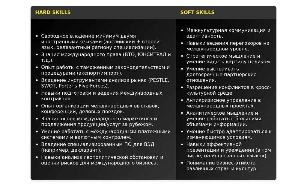 - Профессиональные навыки: ВЭД, Incoterms 2020, ведение переговоров, заключение контрактов
