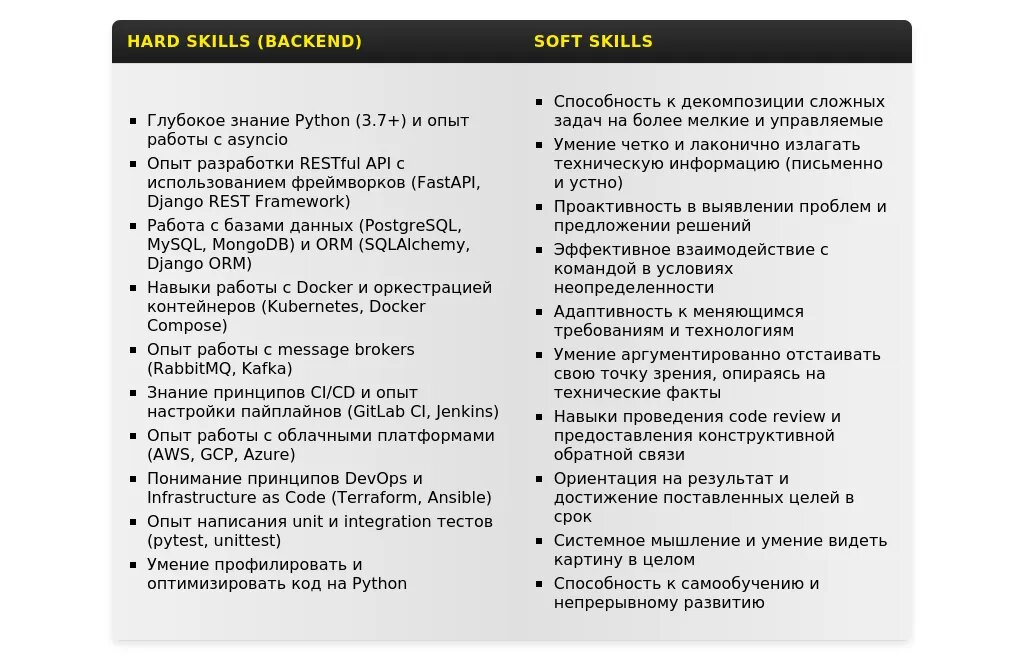 - На какие качества и навыки делать акцент: Знание основных алгоритмов и структур данных, понимание принципов ООП, опыт работы с Git, умение писать чистый и понятный код.