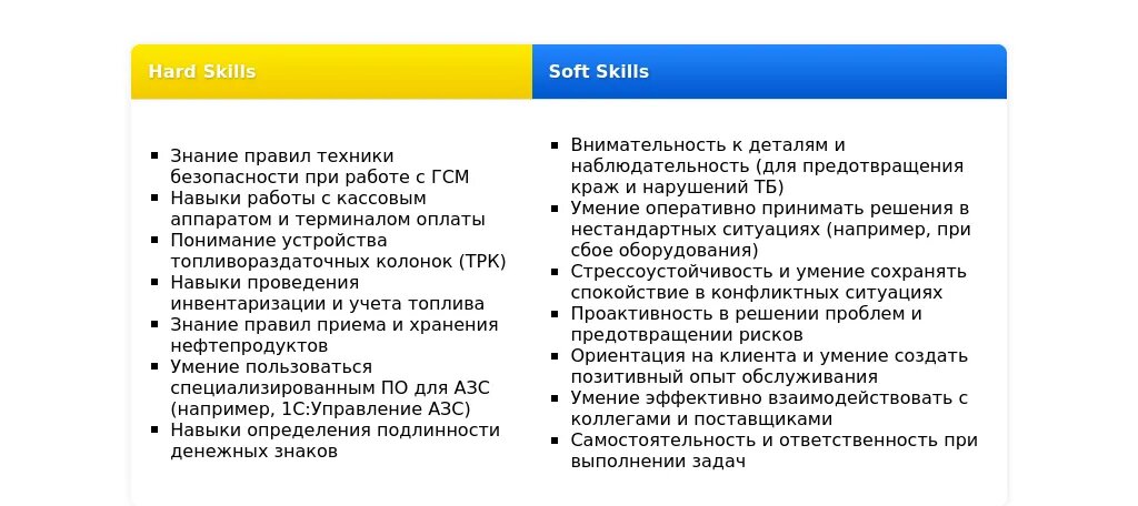 Анализ: Опыт работы в торговле является важным, так как АЗС совмещена с магазином. Знание кассового аппарата и умение общаться с покупателями - ключевые навыки. Ответственность и пунктуальность - важные личные качества. Скрытые требования могут включать знание ассортимента товаров и умение предлагать дополнительные услуги.