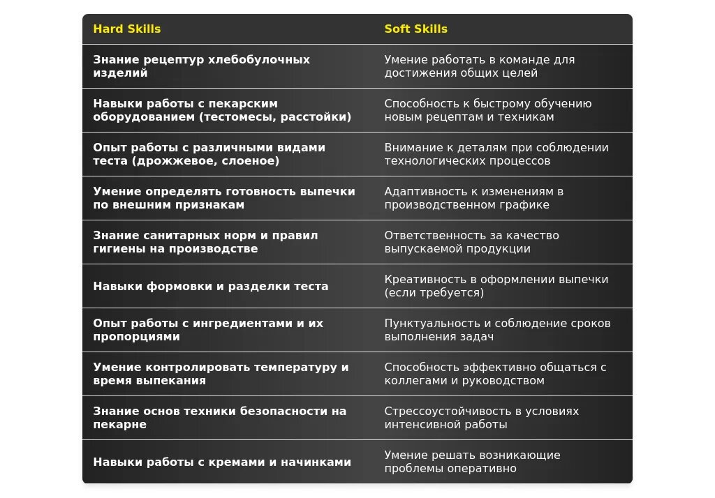 - Для вакансий в небольших пекарнях: "Умение работать в команде", "Готовность к выполнению различных задач", "Ответственность", "Внимательность к деталям".