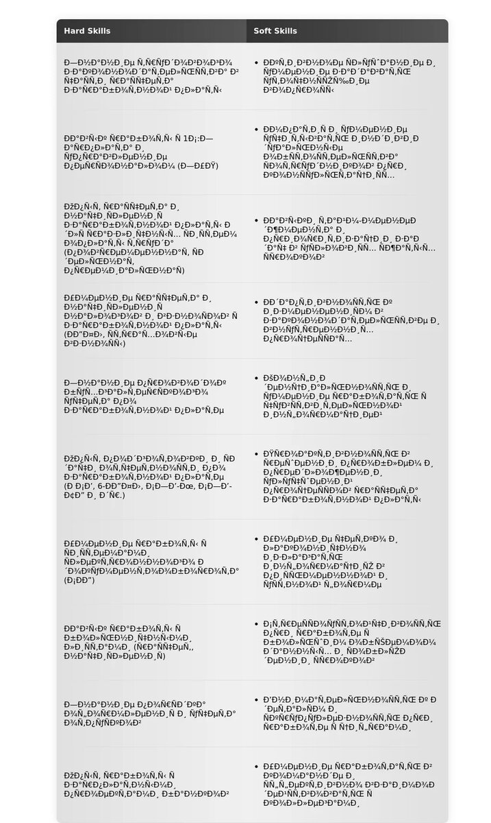 Ключевые слова – это термины и фразы, которые часто встречаются в описании вакансии. Их необходимо использовать в разделе "Навыки", чтобы показать, что вы понимаете требования работодателя. Например: