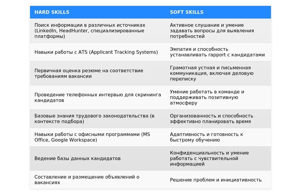 - Массовый подбор: "Опыт работы с большим объемом информации", "Умение работать в режиме многозадачности", "Навыки проведения первичных собеседований".