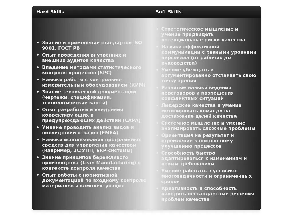 Анализ: В этой вакансии важен опыт работы на руководящей должности, знание систем управления качеством и навыки управления командой.