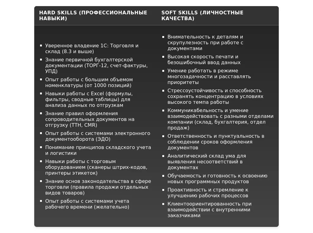 - Для вакансий, требующих знания 1С: "Опыт работы в 1С: Торговля", "Знание складского учета в 1С", "Выписка товара в 1С".
