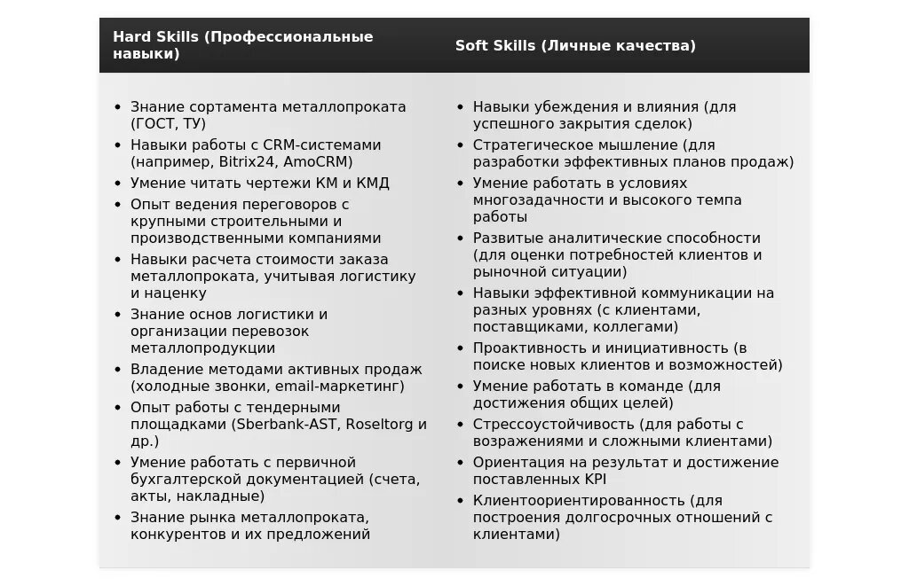 - Что обязательно включить:Ключевые навыки и компетенции, релевантные должности менеджера по продаже металлопроката.