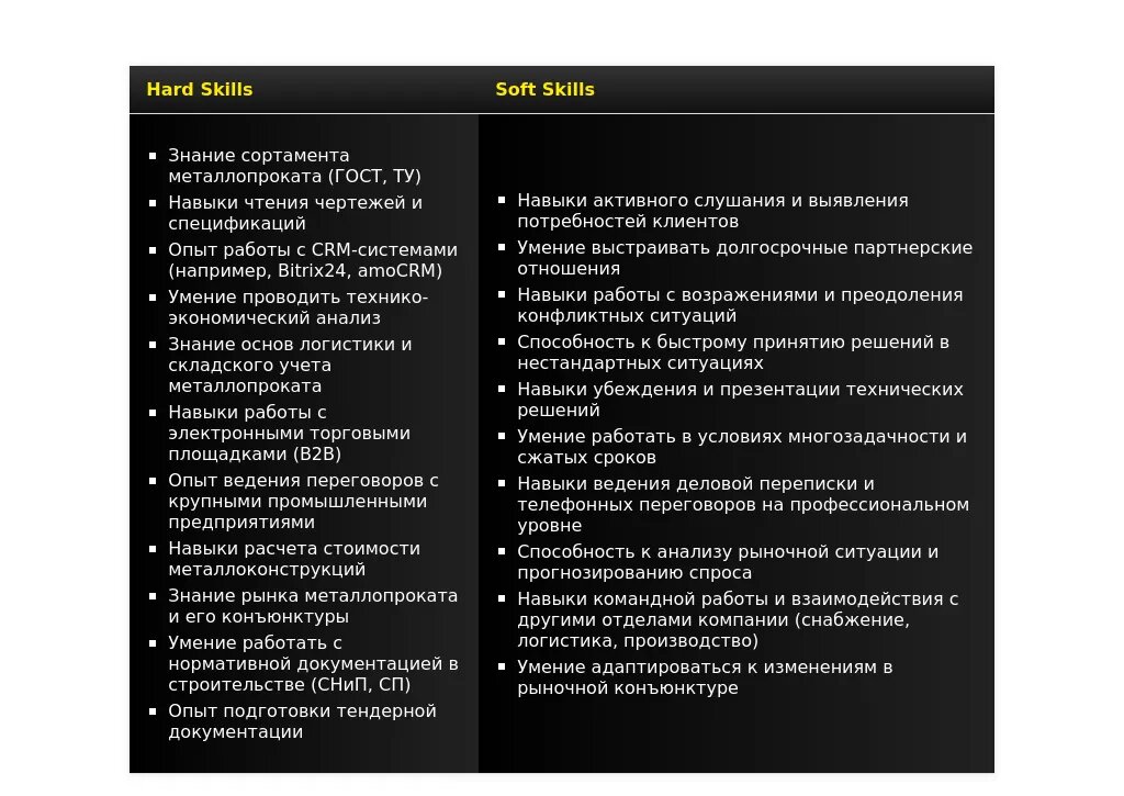 - Технические знания: "Знание сортамента металлопроката", "Разработка технических решений", "Консультирование клиентов по выбору продукции".