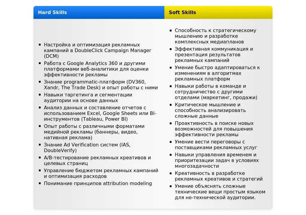 - Группировка: Сгруппируйте навыки по категориям (например, "Рекламные платформы", "Аналитические инструменты", "Soft skills").
