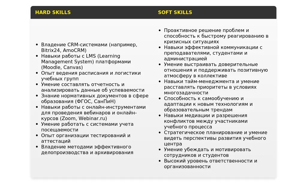 - Что обязательно включить:Ключевые навыки и компетенции, релевантные для позиции координатора учебного центра.