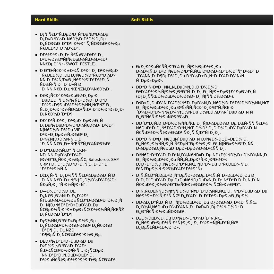 - Описывать навыки в конкретных терминах: Описывайте навыки в конкретных терминах (например, "управление командой из 10 человек", "опыт работы с CRM-системой").